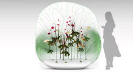 The display of real exotic flowers – a mix of twelve orchids – is held by specially designed set of pockets and sticks, irrigated by an automatic recycled sprinkling water system, and is lit by the inflatable petal, which acts as a background for the flowers’ space.