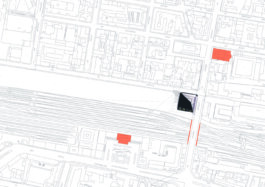 Panoramic View of the square as was, paved, and with the two walled air shafts – serving the floor underneath – that had to be kept intact. Any of the square’s existing parts had to stay, as all related to the future high speed train concourse built underneath.