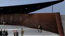 The back side view created by the ‘Wing’ surface made of blackened steel, seen from the bridge along Via Matteotti, is embedded with a fresco of colourful abstracted flowers we called Blooming – selected stills from Ori Gersht work – On Reflection) – so as not to impose the memorial’s experience on the daily commuters outside of the memorial square. (See about Gersht’s originals further below.)