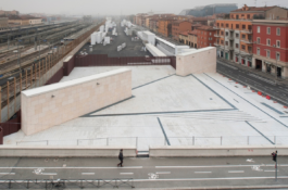 At the Wing wall, similarly, though different in content, there are two juxtaposed photographic epics, embedded in it. Its interior surface portrays a scene of shuttered domestic world and great sadness (as part of the enclosed space in the memorial square), while the exterior surface – seen from outside, along the bridge of Via Matteotti and from Bologna station – communicates colorful abstracted flowers. Our intention here is not to impose the memorial’s experience on the daily commuters out of the square, but enhance the surroundings with the message of beauty and hope, adding qualities to the urban context.